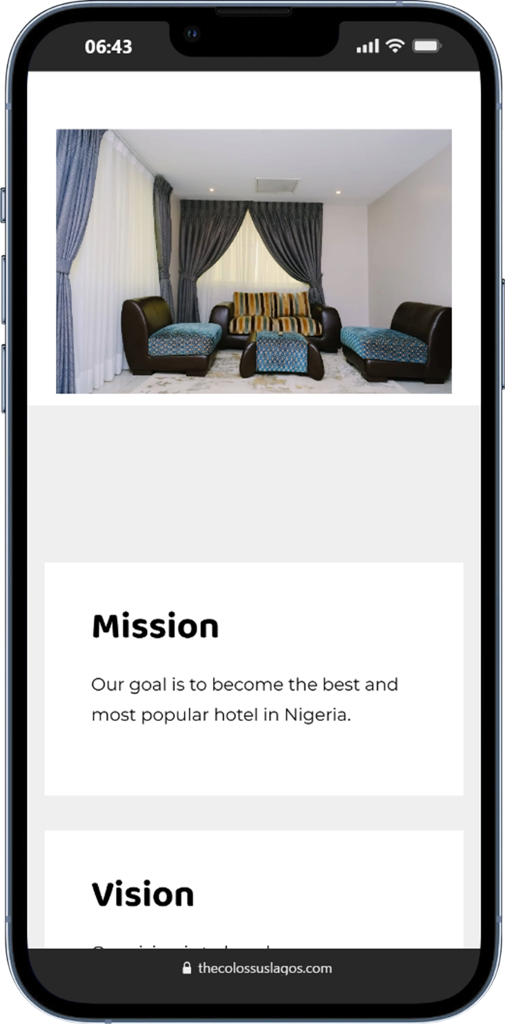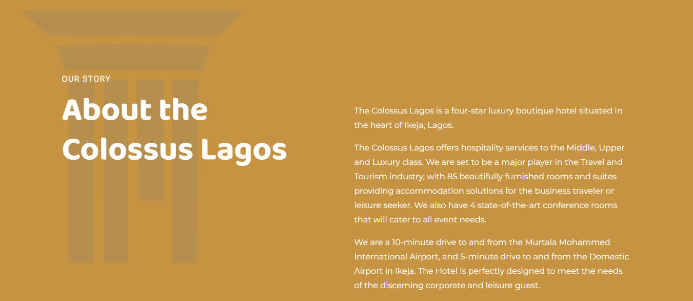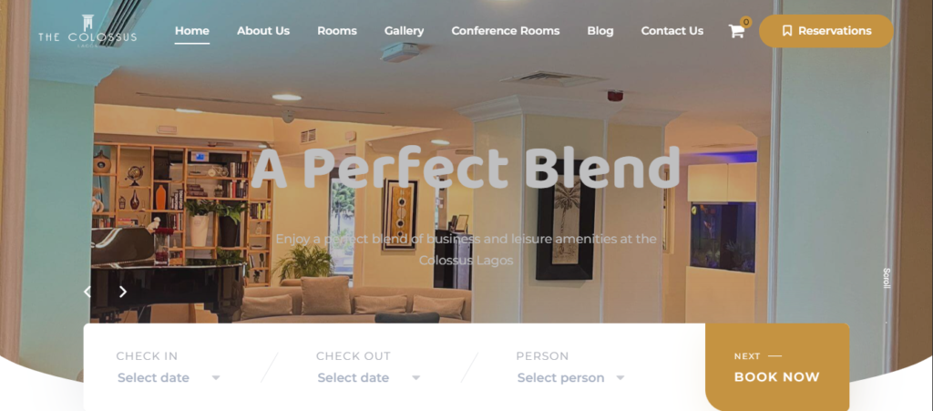 The Colossus Lagos website design project aims to create a visually striking and user-friendly online platform for the premium hospitality brand, The Colossus Lagos. The goal was to establish a strong digital presence that reflects the hotel’s elegance, comfort, and modern sophistication while providing seamless navigation and comprehensive information for prospective guests. We prioritized several key areas in our design process, including: